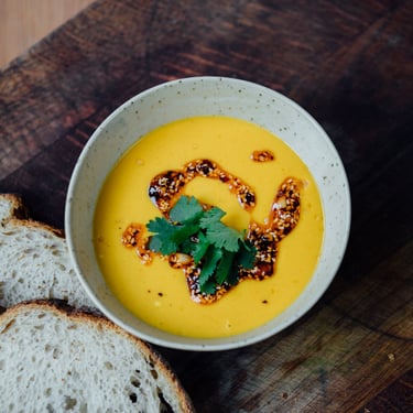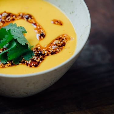 Moliūgų, morkų ir imbiero sriuba su Black bean Rãyu pagardu
